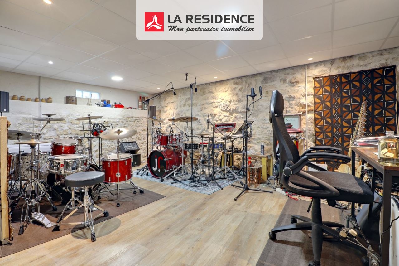 La véranda spacieuse mène à l’habitation secondaire, qui propose au rez-de-chaussée une belle pièce aux pierres apparentes, actuellement aménagée en studio de musique. À l’étage, vous découvrirez deux chambres chaleureuses ainsi qu’une salle d’eau avec WC et un espace buanderie pouvant être transformé en cuisine, rendant ainsi le second logement totalement indépendant au besoin.