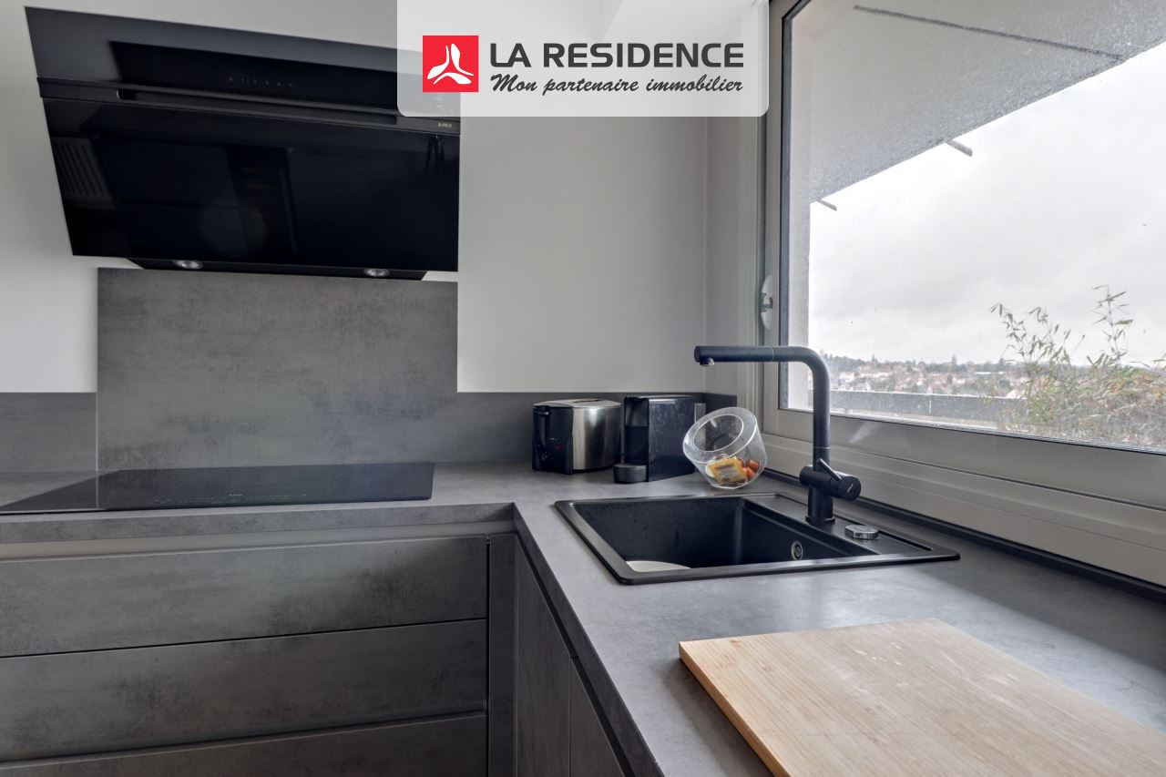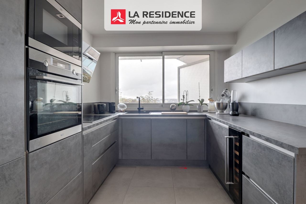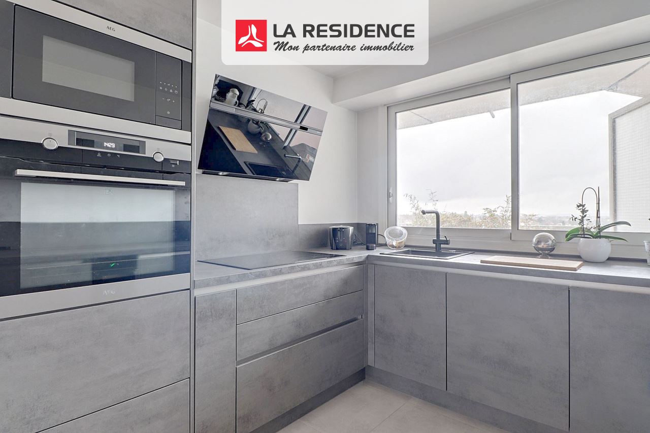 Le séjour spacieux, baigné de lumière grâce à son exposition ouest, ouvre sur une terrasse offrant une vue dégagée. La cuisine, fonctionnelle et design, invite à la convivialité.