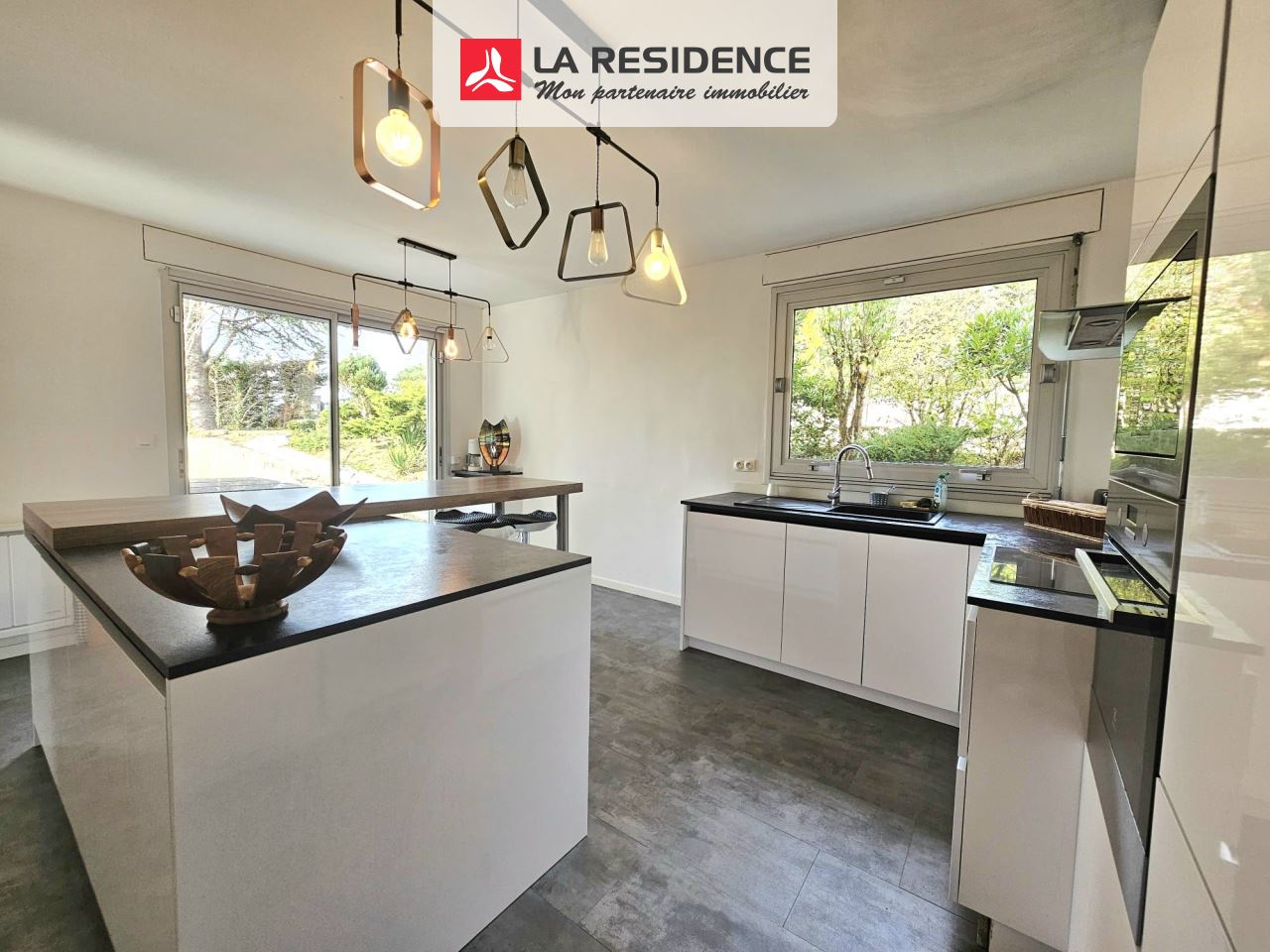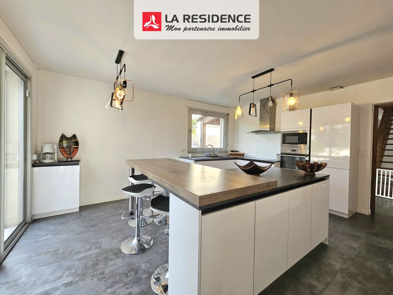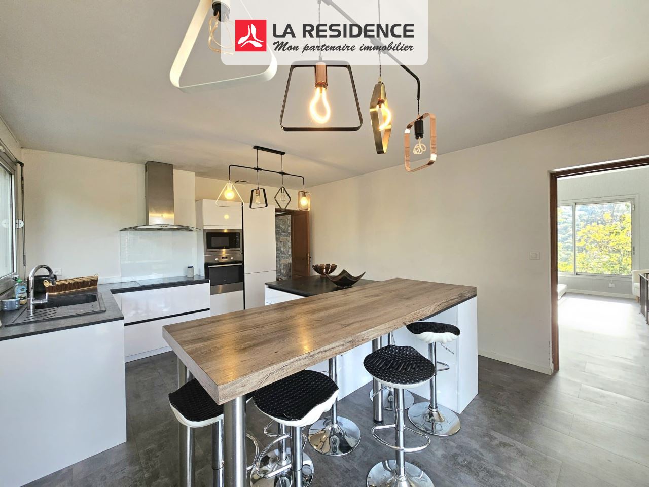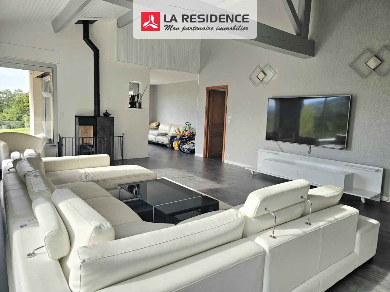 La pièce de vie, vaste et ouverte, respire la clarté et la fluidité. La chaleur du poêle à granulés y diffuse une atmosphère douce et régulière, tandis que la cuisine indépendante invite à la convivialité, pensée comme un véritable espace de partage.